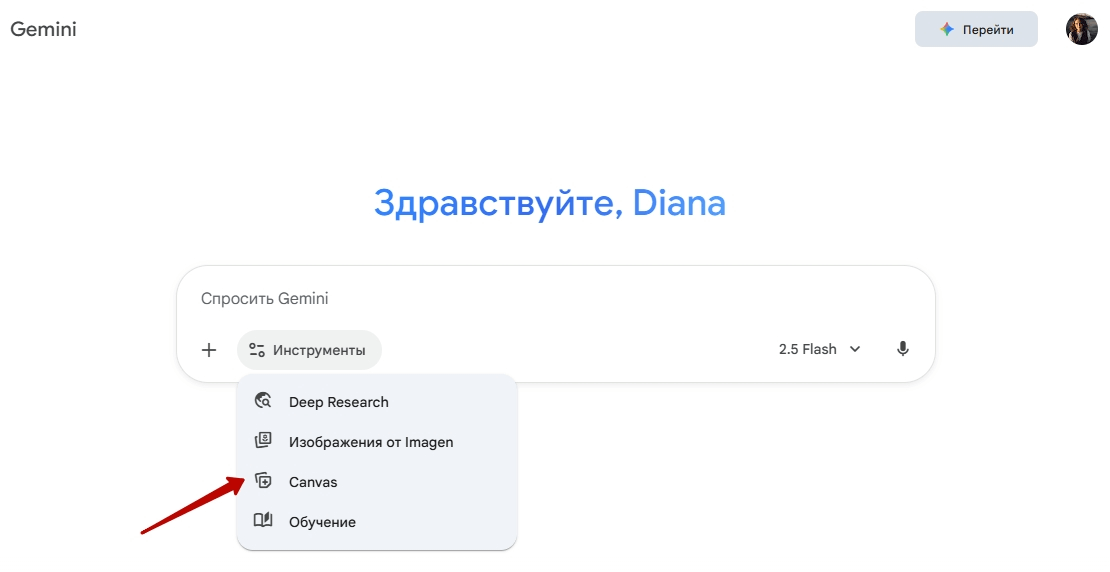 В Gemini режим Canvas встроен в интерфейс как на десктопе, так и в мобильном приложении. Чтобы открыть холст, нужно нажать кнопку Canvas под полем ввода: перейдите в «Инструменты» → Canvas. После этого отправьте запрос, откроется экран, где слева будет диалог с нейросетью, а справа — рабочее поле для редактирования.