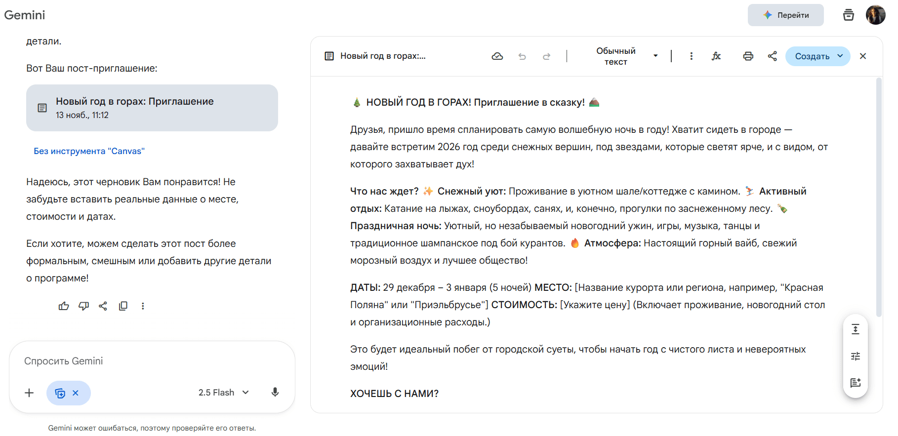 В ChatGPT или Gemini холст работает примерно одинаково. Немного отличается интерфейс и быстрые инструменты. При выборе площадки для работы можно опираться на эти критерии, а в остальном вы получите схожий результат.