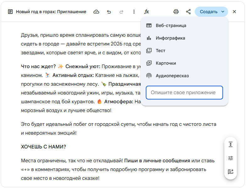 Веб-страница, инфографика и «Опишите свое приложение». Эти три инструмента работают примерно одинаково. Gemini преобразует статью в сверстанную веб-страницу с инфографикой и интерактивными элементами.