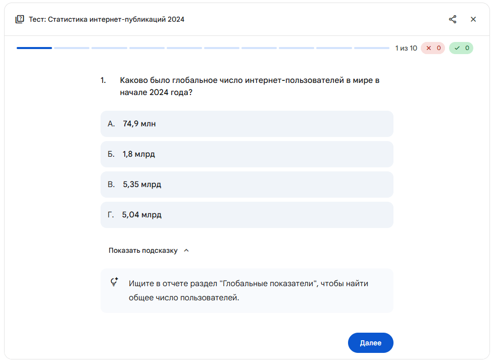 Тест. Создает викторину примерно на 10 вопросов. Удобно, если вы готовите обучающий материал и хотите добавить самопроверку.