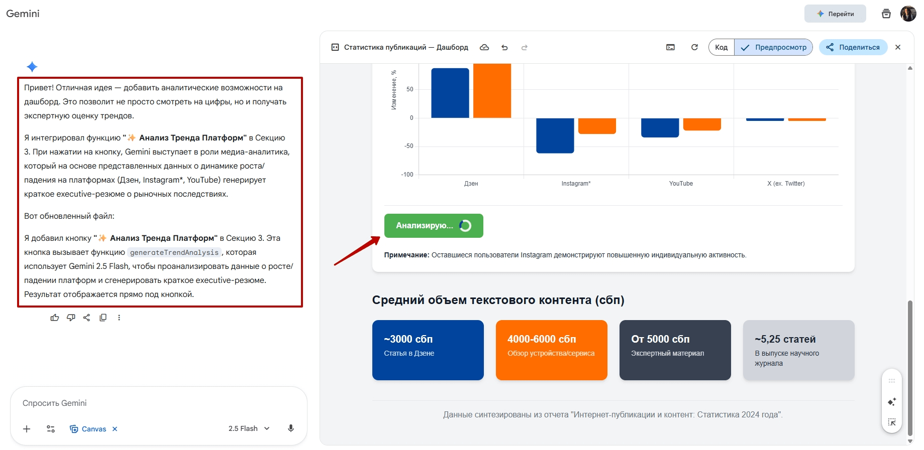 Например, на скриншоте чат-бот добавил кнопку «Провести анализ», после которой модель резюмирует и объясняет цифры на инфографике.