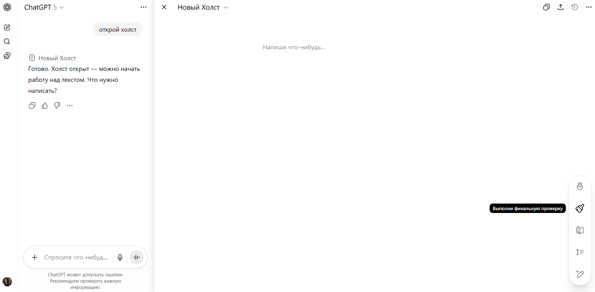 Технические сбои. Иногда Canvas не открывается или показывает пустой экран. При повторном открытии документы могут не отображаться. Бывает, что изменения не применяются — например, заголовок не вставляется, хотя ИИ пишет, что всё готово. Также встречаются ситуации, когда холст теряет часть текста или генерирует неполный результат.