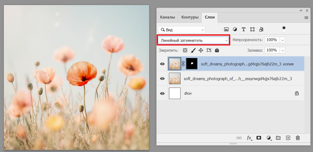 Затем перекрасим цветок с помощью режима наложения. С маской и «линейным затемнителем» мак стал красным.