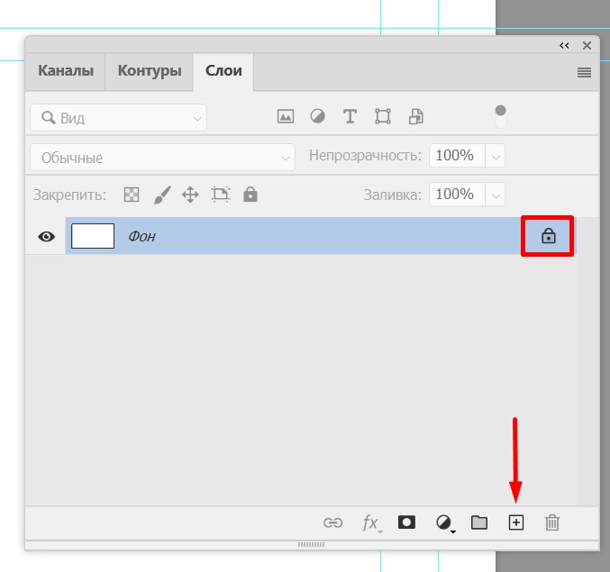 При открытии нового проекта на панели слоев будет только фон с заливкой белого цвета. Чтобы внести в него изменения, нужно снять защиту — кликнуть по значку замка справа. Либо создать новый слой, нажав прямоугольник с плюсом или комбинацию Ctrl + Shift + Alt + N.