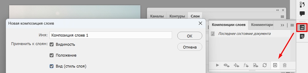 Чтобы создать новую композицию, нужно кликнуть на значок плюса в панели и уточнить настройки — видимость, положение, стиль слоя.