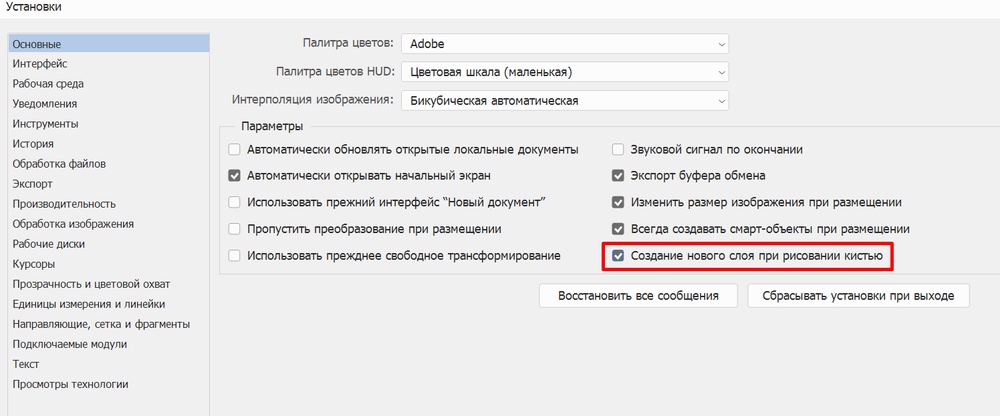 Безопаснее создать новый пустой слой и рисовать на нем. Чтобы ускорить процесс, можно включить автоматическое создание нового слоя при рисовании кистью. Настройка находится в меню «Редактирование» → «Настройки» → «Основные» → «Создавать новый слой при рисовании кистью». Можно перейти в него нажав Ctrl + K.