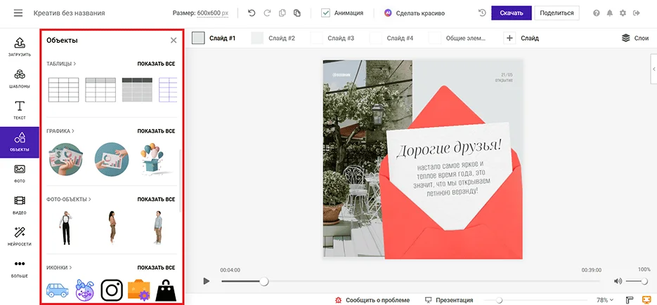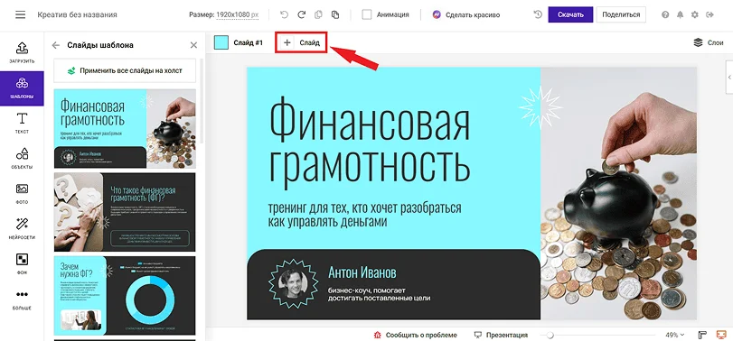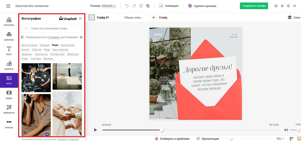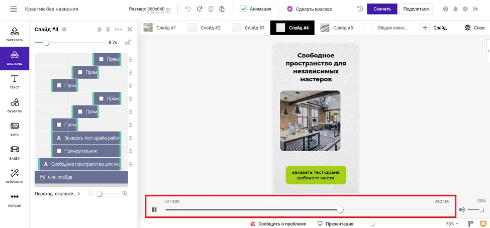 После выбора шаблона откроется редактор с набором анимированных слайдов. С ними можно работать так же, как с видеороликами.