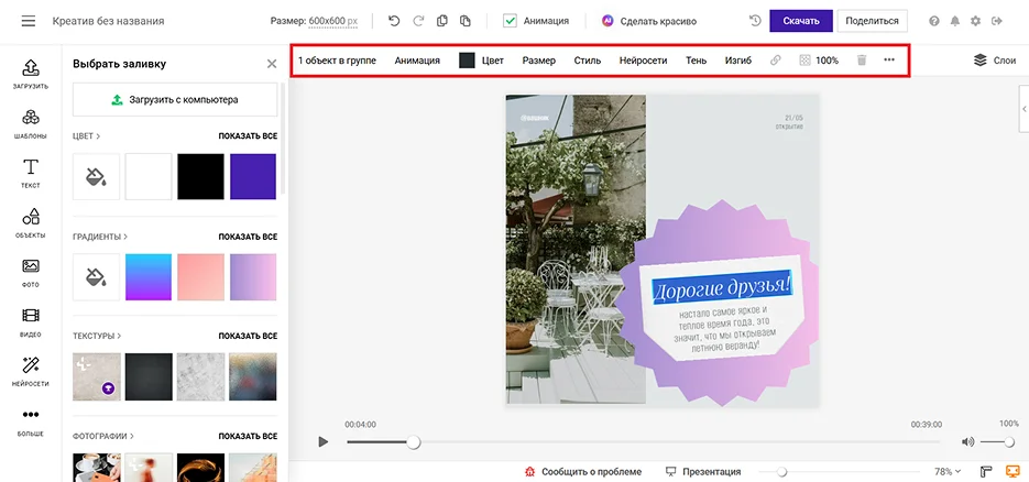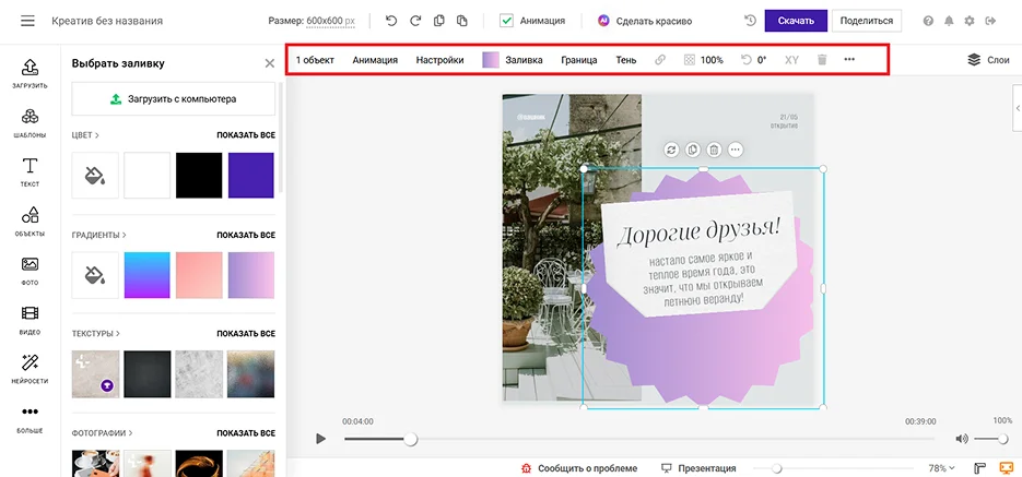 Все элементы в дизайне можно редактировать с помощью инструментов в верхнем тулбаре. Вы можете поворачивать объекты, добавлять анимации, использовать заливку, устанавливать границы и интенсивность теней. Дополнительные инструменты для изменения объектов скрыты в контекстном меню с изображением трех точек (…).