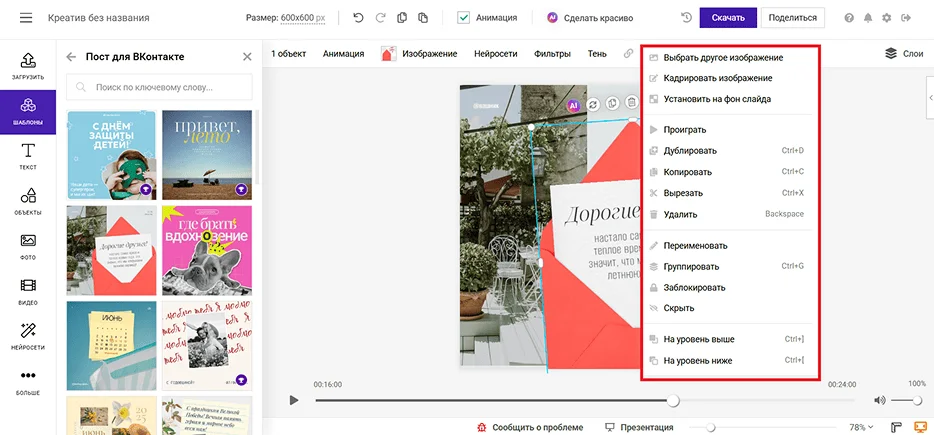 Редактировать элементы можно и прямо на холсте — просто кликаете по объекту правой кнопкой мыши и выбираете нужное действие в контекстном меню. Элементы шаблона можно перемещать между слоями, вырезать, группировать, скрывать или блокировать. Если что-то не понравится, нажмите на стрелочку отмены в верхнем тулбаре или используйте комбинацию Ctrl + Z.