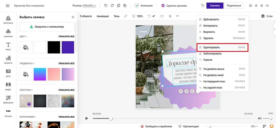 Если вам нужно сгруппировать объекты — например, надпись с подложкой в виде объекта, — выделите все элементы, удерживая кнопку Shift, затем кликните по ним правой кнопкой мыши и нажмите «Группировать». После этого вы сможете перемещать блок элементов между слоями. В контекстном меню можно применять к объектам любые действия: группировка и разгруппировка, перемещение между слоями и планами, блокировка и скрытие.