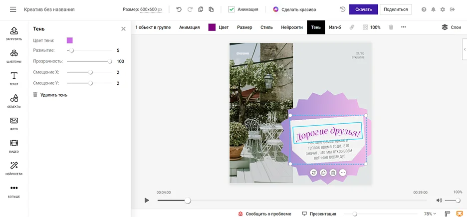 Если вам не нравится результат, подготовьте графику в бесплатных нейросетях, а редактор используйте для сборки дизайна.