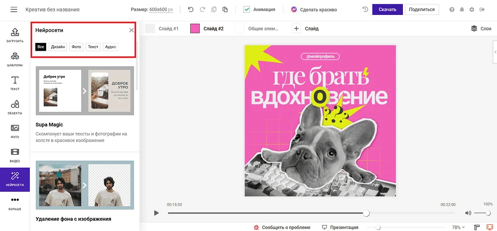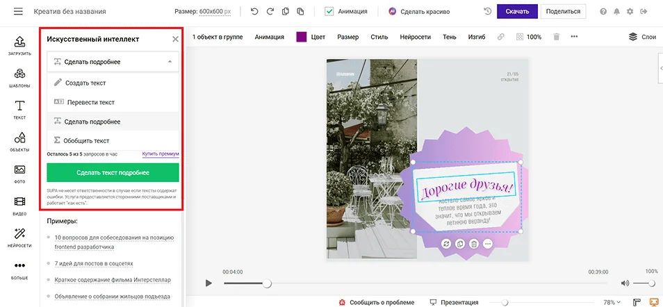 В верхнем тулбаре расположены AI-инструменты для работы с текстом — раздел «Нейросети». У нейросети для работы с текстами в SUPA есть ограничения по количеству запросов. Если не хотите оформлять подписку, лучше использовать сторонние сервисы и переносить в дизайн уже готовые заголовки и подписи. AI-инструменты для работы с другими элементами дизайна расположены в левом тулбаре.