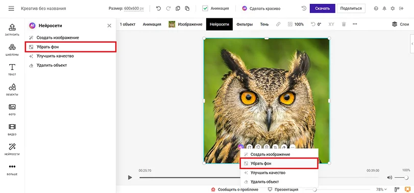 Если вам нужно удалить фон с фотографии, используйте AI-инструменты Supa. Кликните правой кнопкой мыши по фото на холсте, нажмите на иконку «AI» и выберите в контекстном меню «Убрать фон». В бесплатной версии SUPA можно удалить фон с пяти изображений в месяц.