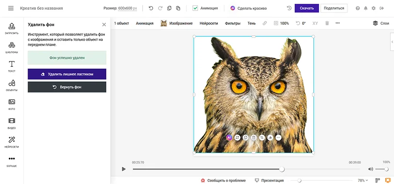 Чтобы убрать все лишние пиксели вокруг изображения, поставьте галочку у «Обрезать до видимой части». Если нейросеть оставит часть фона, его можно удалить с помощью ластика, но эта функция доступна только на платном тарифе.