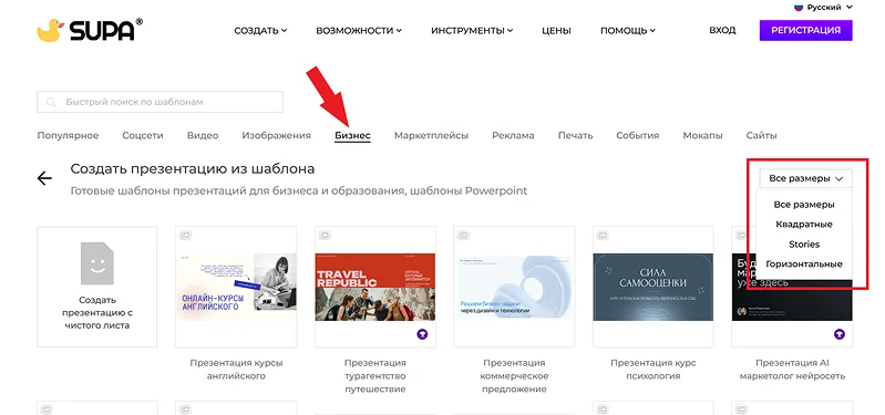 Все шаблоны презентаций находятся в разделе «Бизнес» SUPA Dashboard. В коллекции есть шаблоны презентаций для разных видов бизнеса: маркетинговые и рекламные агентства, автошколы, ветеринарные клиники, салоны красоты, услуги частных специалистов и т. д.