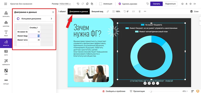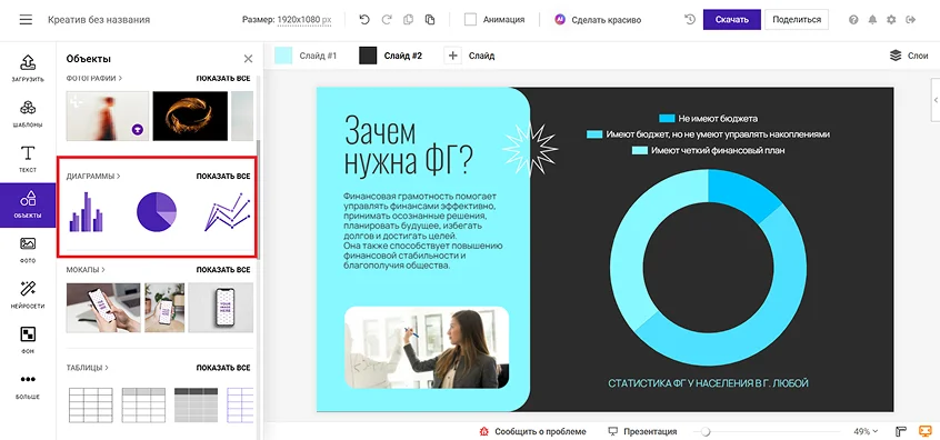 Презентации в SUPA можно дополнить диаграммами, гистограммами и графиками. Чтобы использовать такие элементы в дизайне, перейдите в раздел «Объекты — Диаграммы» и выберите подходящий элемент.