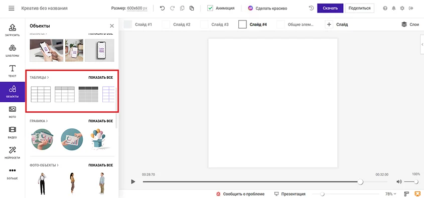 В SUPA можно создавать таблицы и добавлять их в разные дизайны — например, в презентации или в графику для маркетплейсов. Этот инструмент находится в левом сайдбаре, в разделе «Объекты». Нажмите на «Показать все», чтобы увидеть все шаблоны таблиц в SUPA.