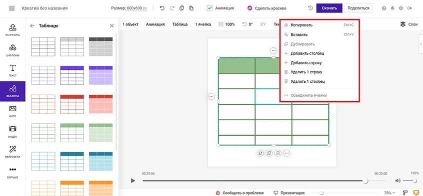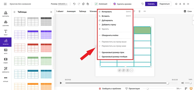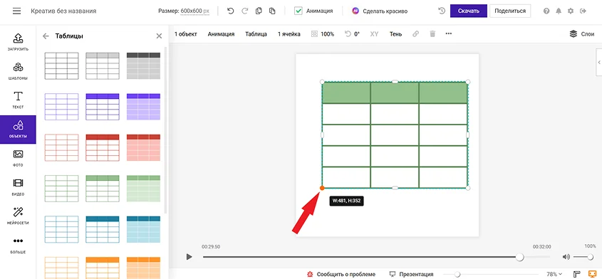 Выберите шаблон из библиотеки контента и отредактируйте его по своему усмотрению: измените размер таблицы, потянув её за уголок, и расположите на холсте так, как вам нужно.