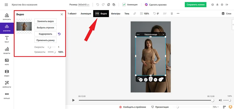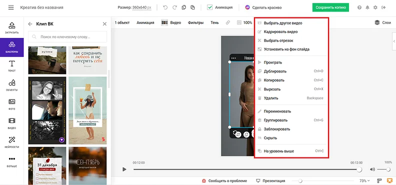 Если на холсте уже есть видео, вы можете отредактировать его по своему усмотрению. Кликните по нему правой кнопкой мыши, чтобы открыть контекстное меню, или откройте в верхнем тулбаре раздел «Видео».