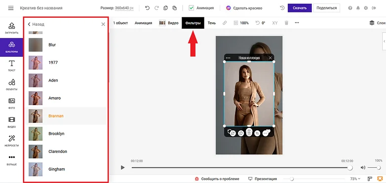 В разделе «Фильтры» вы можете поменять настройки цветокоррекции или выбрать готовый фильтр. Настройки можно сохранить в собственный стиль и применять его к другим видео в дизайне. Для этого нажмите на три точки (...) в верхнем тулбаре и выберите в меню «Копировать стиль».