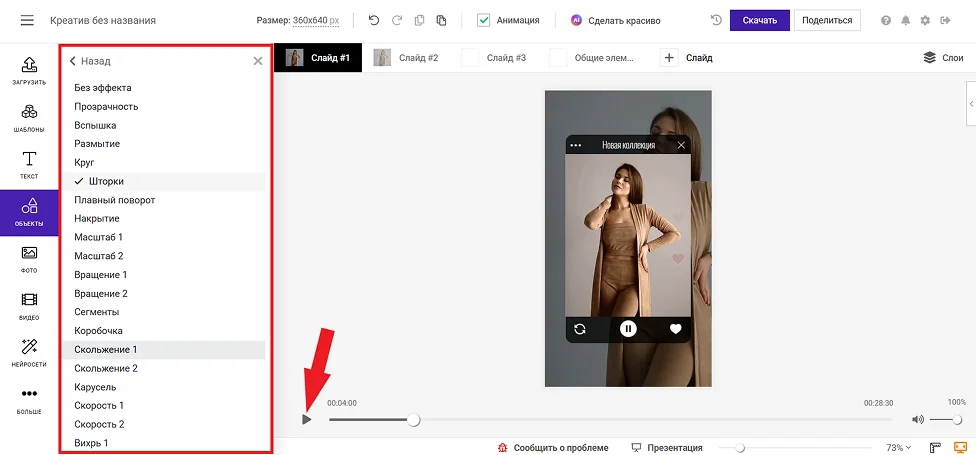Если видео состоит из нескольких слайдов, между ними можно сделать эффектный переход. Доступные варианты переходов скрыты в контекстном меню под списком всех элементов на холсте.