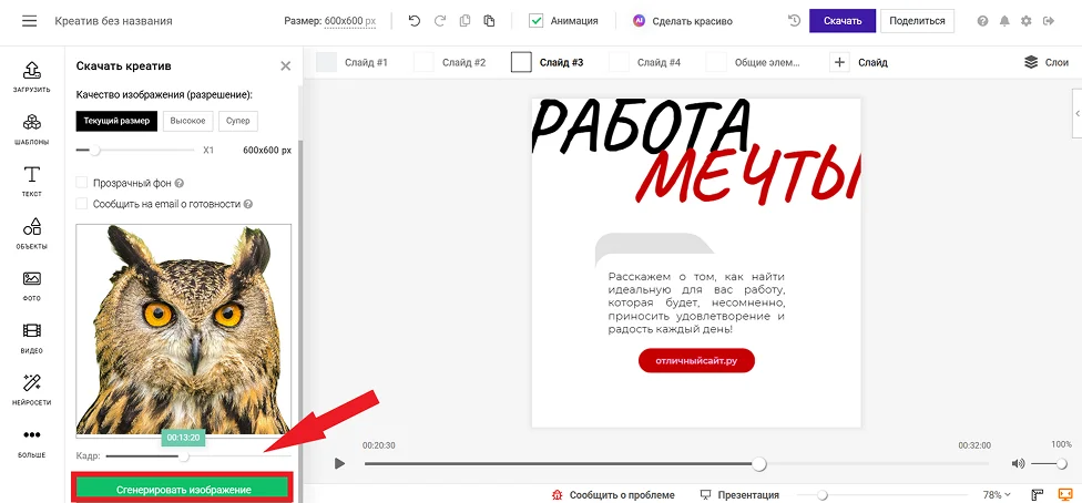 После того как сохраните все дополнительные настройки в SUPA, нажмите на кнопку «Сгенерировать изображение». Переключиться на нужный слайд можно с помощью бегунка у кнопки. Сервис подготовит для скачивания тот слайд, что отображается на превью.