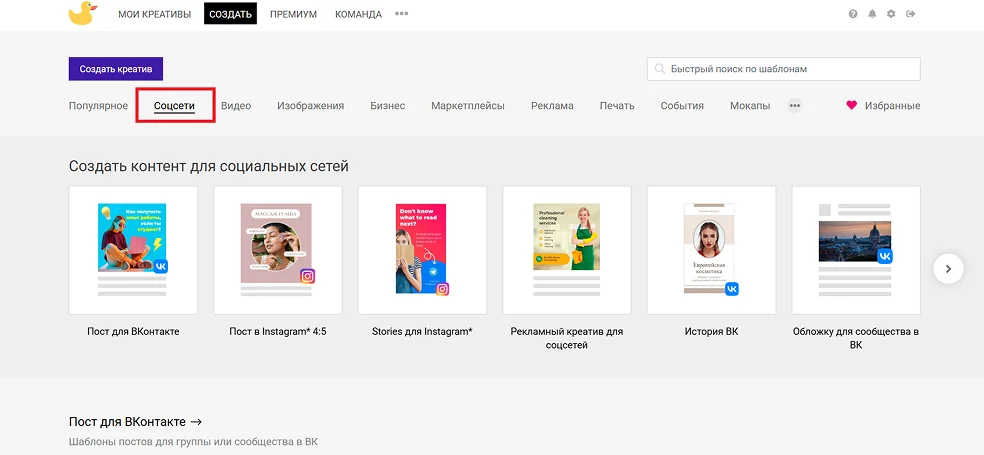 После клика по кнопке «Создать креатив» перейдите в раздел «Соцсети», чтобы выбрать шаблон нужного размера.