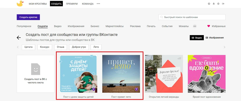 У каждого формата графики есть бесплатные и платные шаблоны — последние отмечены иконкой с кубком и открываются только после покупки подписки «Премиум».