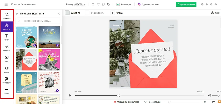 Выбираем подходящий формат и шаблон, переходим в редактор SUPA. Все инструменты для работы с графикой расположены в левом тулбаре. В контекстном меню «Больше» скрыты дополнительные инструменты редактора: библиотека фонов, аудио, иконок, анимаций, диаграмм и многое другое. Часть контента доступна только на тарифе «Премиум».