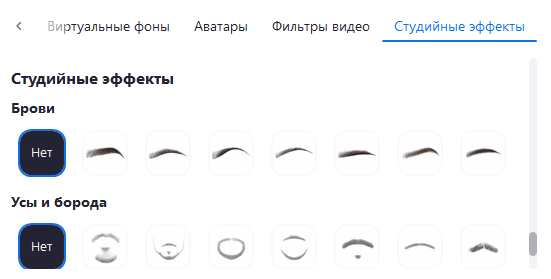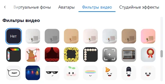 Ниже находится раздел «Фоны и эффекты», где можно выбрать виртуальный фон, применить фильтры или использовать аватар.