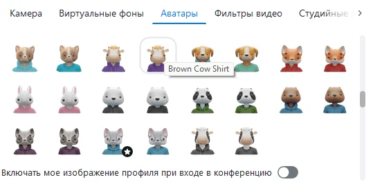 Аватары. Эта функция заменяет видео пользователя на 3D-аватар животного или человека, который повторяет движения головы и мимику. Можно выбрать готовый аватар или создать свой в редакторе. Есть функция «Применить ко всем будущим конференциям», но лучше отключить ее, чтобы случайно не присоединиться к деловому созвону в забавном виде.