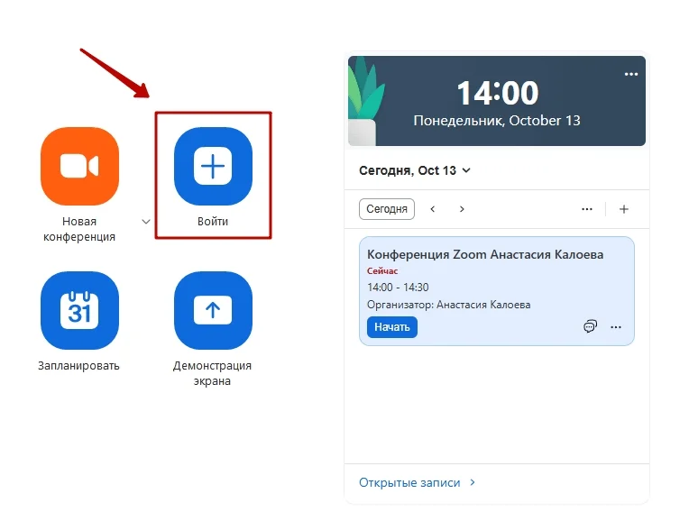 Используется, когда известны идентификатор и пароль встречи, но нет прямой ссылки на встречу. Нужно открыть приложение Zoom, на главной странице нажать кнопку «Войти».