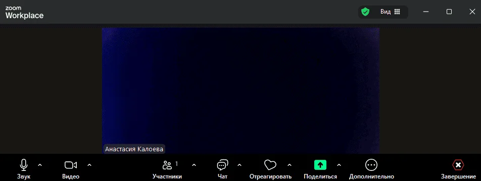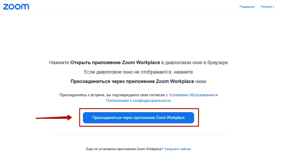 Нужно подтвердить запуск, нажав кнопку «Присоединиться через приложение “Zoom Workplace”». Приложение запустится и автоматически подключится к конференции. Если пользователь не авторизован в аккаунте, система предложит ввести имя, которое будет отображаться для других участников.