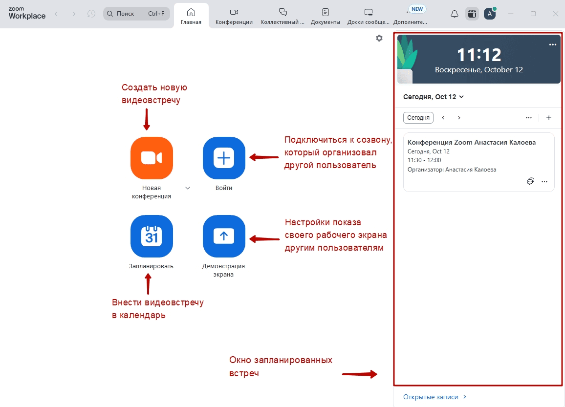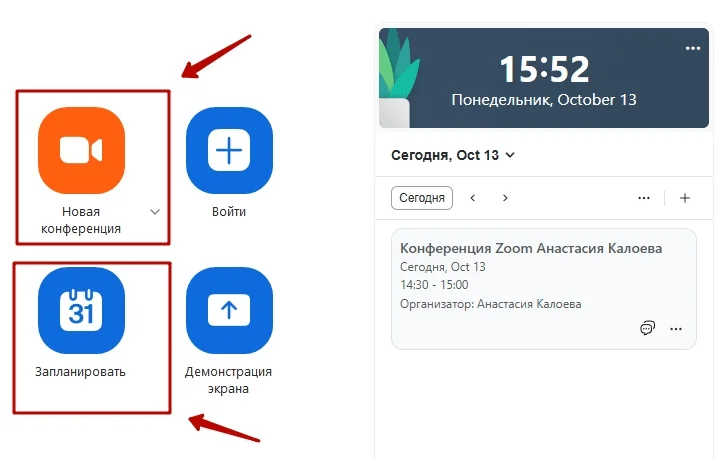 Организовать собственную конференцию можно с главной страницы десктопного приложения. Выбрать кнопку «Новая конференция», если нужно сразу запустить видеовстречу, или нажать на «Запланировать», чтобы организовать ее на конкретную дату и время.