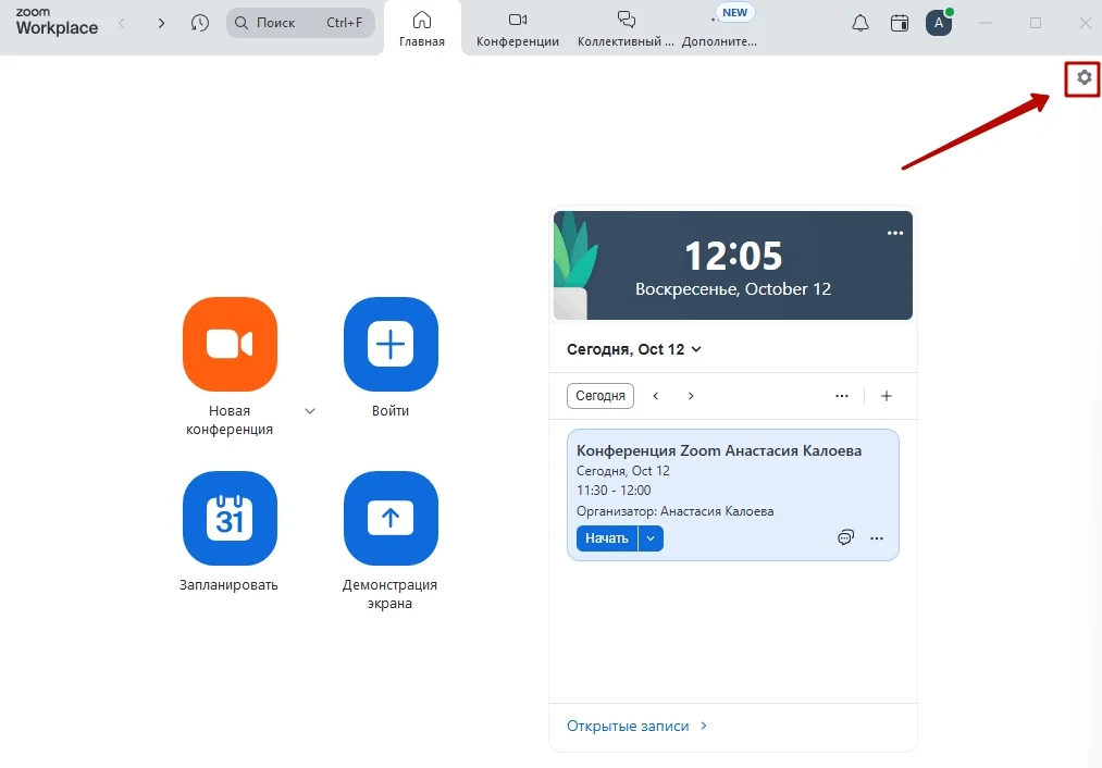 Перед видеоконференцией лучше заранее убедиться, что камера и микрофон работают. Для этого нужно перейти в настройки, кликнув на значок шестеренки на главной странице.