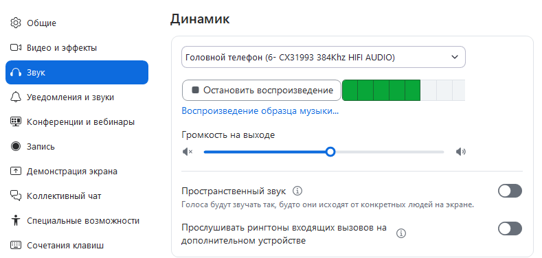 Для настройки звука на главной странице Zoom нажмите на значок шестеренки и перейдите в раздел «Звук». В верхней части окна можно выбрать устройство вывода — например, наушники, встроенные динамики ноутбука или внешние колонки. Кнопка «Проверить динамик» запускает короткую тестовую мелодию. Если звук воспроизводится, устройство работает корректно. Если нет — нужно увеличить громкость или выбрать другое устройство из списка.