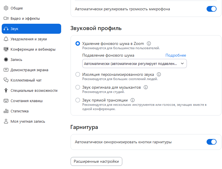 Гарнитура. При включении этой функции Zoom синхронизируется с кнопками на подключенной гарнитуре — например, для ответа на звонок или отключения микрофона.