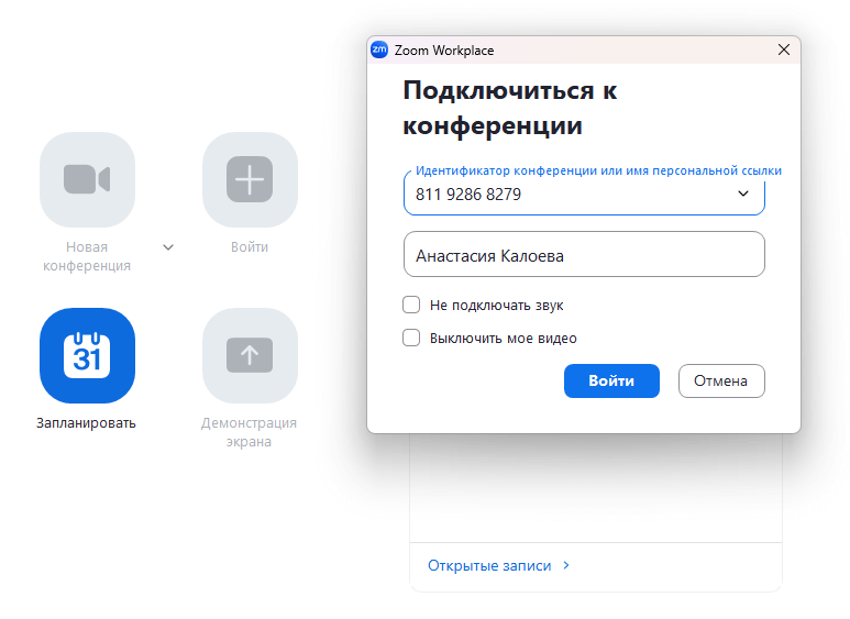 В поле ниже можно отредактировать свое имя — его увидят другие участники. Если нужно подключиться без звука или видео — поставьте флажок возле «Не подключать звук» или «Выключить моё видео», нажмите кнопку «Войти». Если для конференции установлен пароль, введите его в появившемся окне.