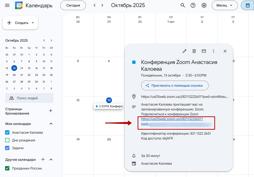 Этот способ используется, если приглашение на встречу было отправлено в виде события в Google Календарь или Outlook. В информации о встрече должна быть прямая ссылка на конференцию или специальная кнопка, например, «Подключиться с помощью Zoom». После этого откроется браузер и запустится приложение Zoom.