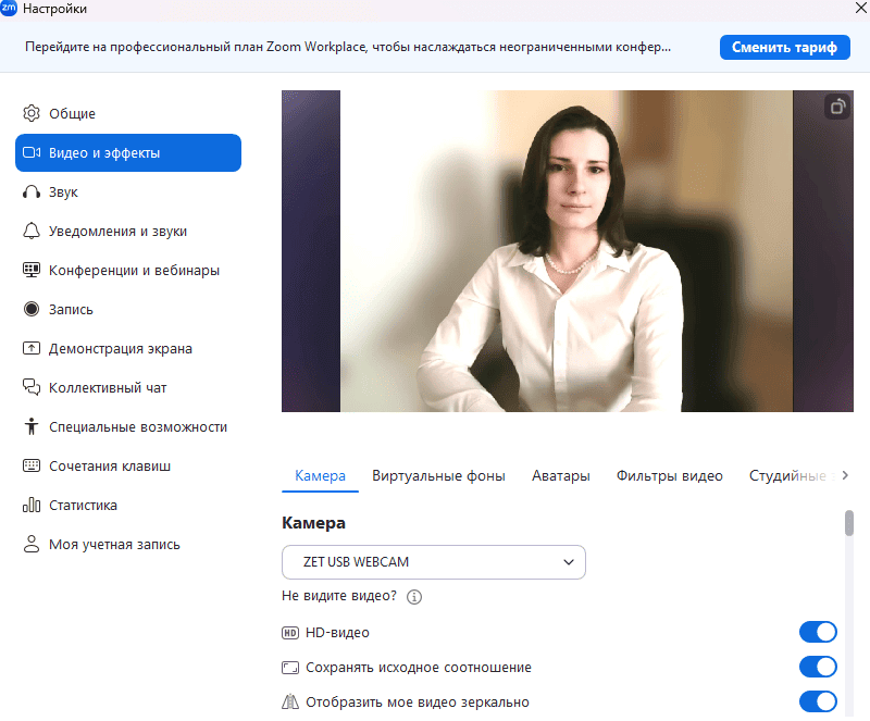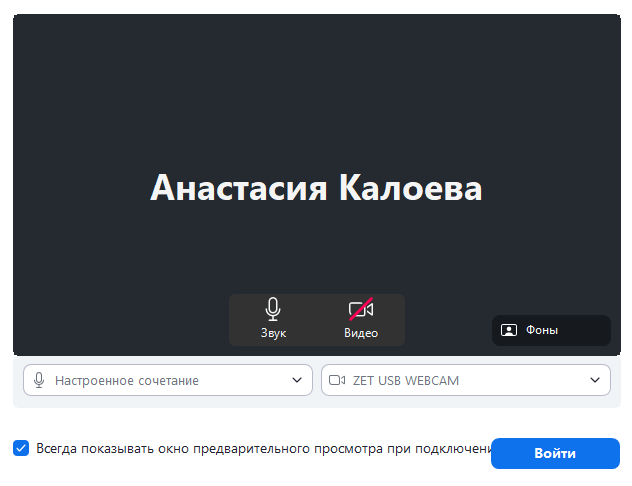 Предпросмотр видео. Здесь можно проверить, как работают камера и микрофон, или выключить их совсем. Также можно выбрать и поменять виртуальный фон перед входом в конференцию.
