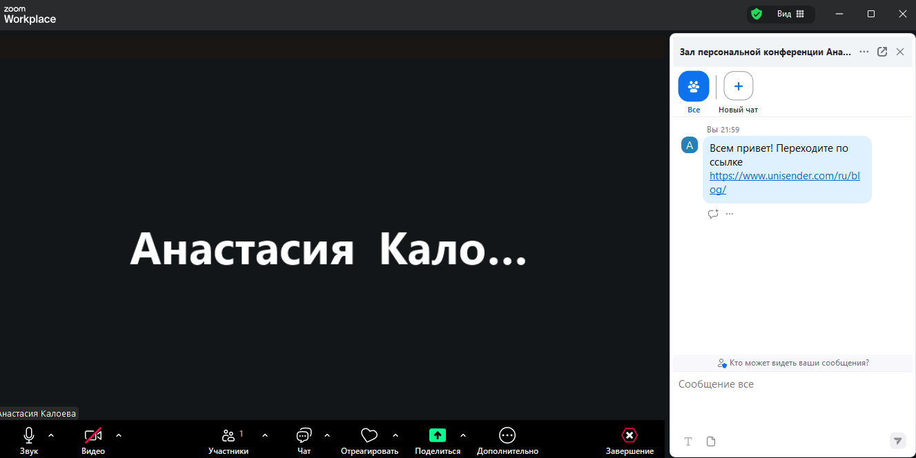Чат. Можно отправлять сообщения всем участникам встречи или отдельным людям, если это разрешено в настройках конференции.