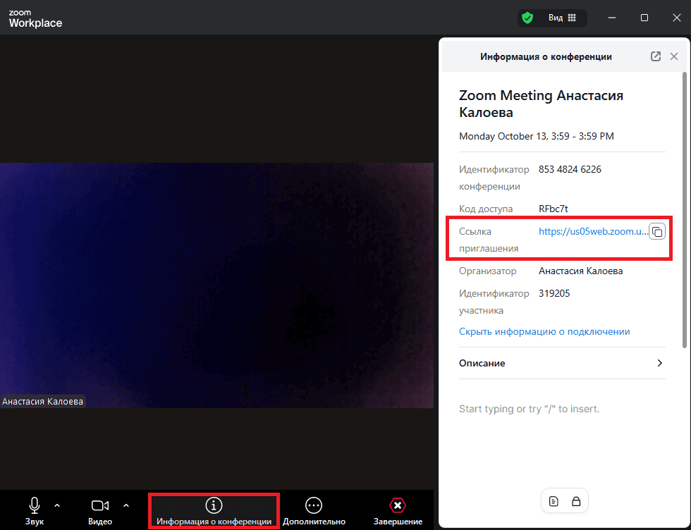 После запуска встречи появится окно с ссылкой для приглашения. Ее можно скопировать и отправить участникам вручную, чтобы они подключились к конференции. Также можно воспользоваться идентификатором и паролем к конференции, которые Zoom сгенерирует автоматически.