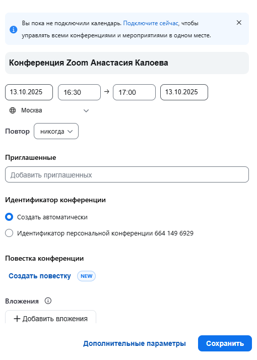 В настройках будут автоматически сгенерированы ссылка для входа на конференцию и пароль для доступа, если нужно. После сохранения Zoom предложит отправить приглашение участникам или скопировать его вручную.