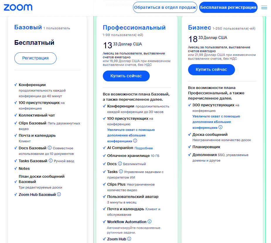 На бесплатном режиме можно создавать конференции до 100 человек длительностью до 40 минут. Если не хватит времени, придется создавать новую видеовстречу с другой ссылкой. Чтобы не сталкиваться с такими ограничениями, можно взять подписку Pro или Business. Для оплаты российским пользователям придется воспользоваться зарубежной картой.