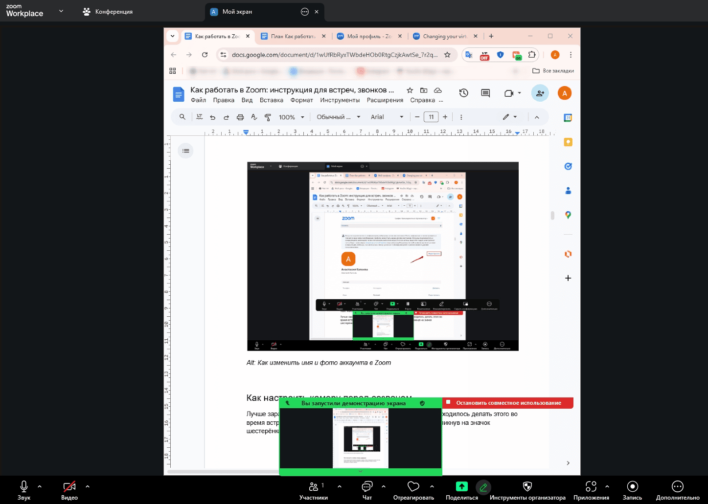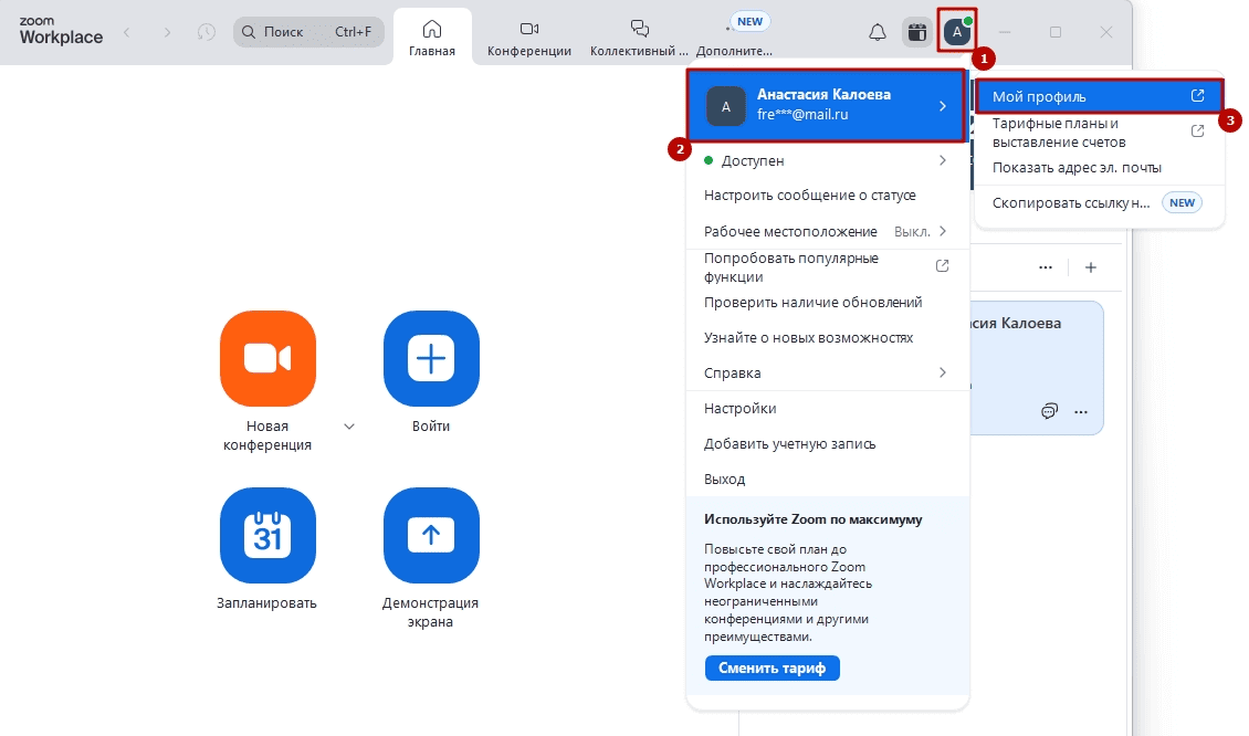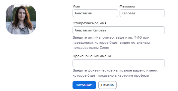 Для начала нужно настроить данные профиля, указать свое реальное имя и загрузить фото профиля. Они будут видны при подключении к встречам в Zoom.
