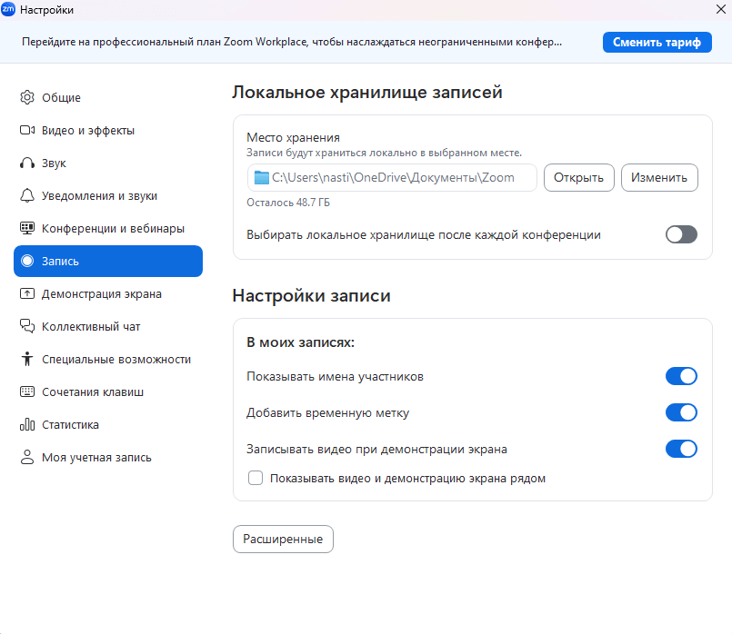 Если включить настройку «Выбирать локальное хранилище после каждой конференции» после каждой встречи Zoom будет спрашивать, куда сохранить новую запись.