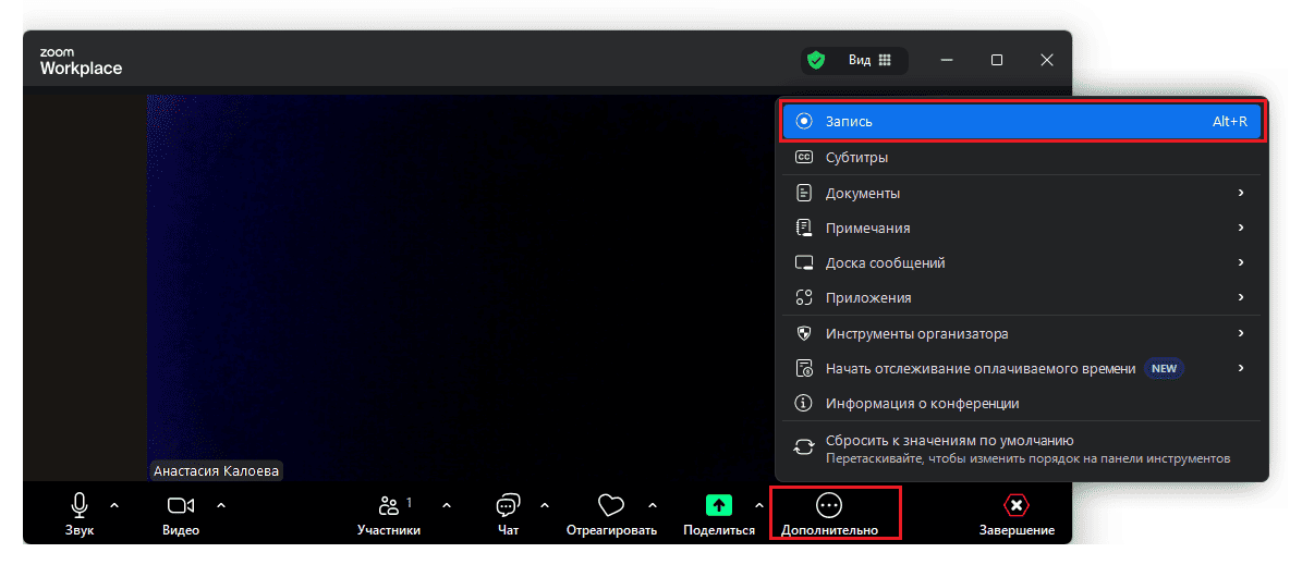 Во время встречи, когда организатор включает запись, все участники получают уведомление. Если они дают согласие на запись, то в нижнем левом углу экрана появляется значок с надписью «Запись».