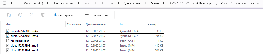 После конференции Zoom автоматически конвертирует запись конференции. Затем на компьютере автоматически открывается папка с сохраненными файлами.