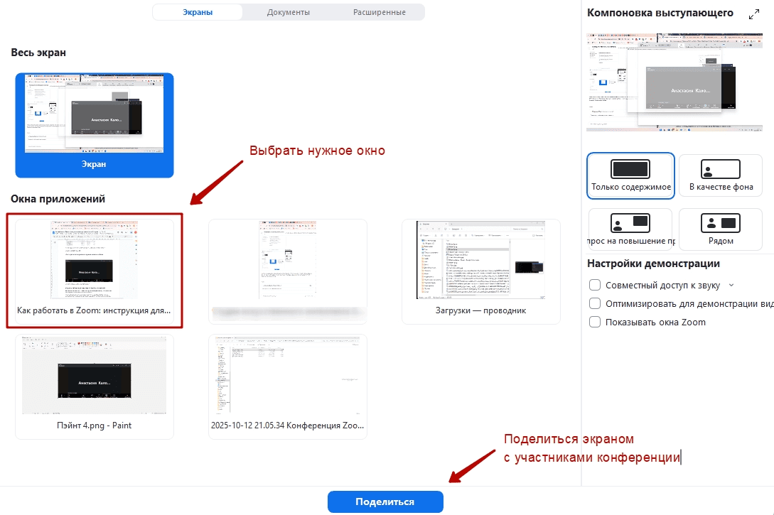 Здесь можно выбрать, что именно будет показано участникам. Если выбрать «Весь экран» — участники увидят весь рабочий стол пользователя, включая задачи панели, все открытые окна и уведомления.