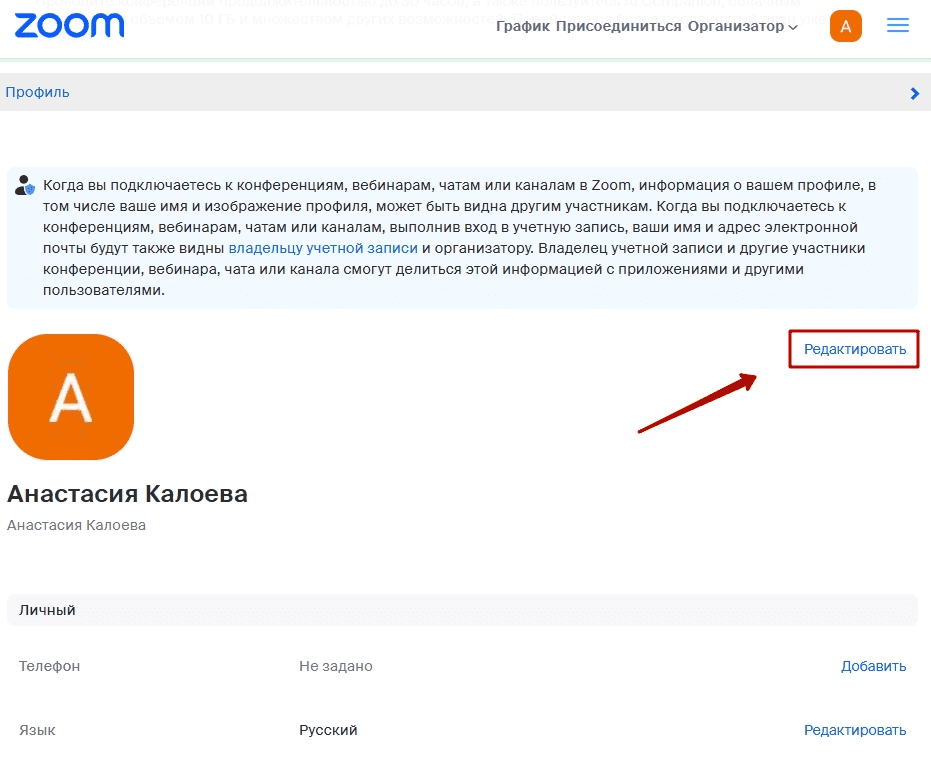 В окне браузера откроются настройки аккаунта в Zoom. Чтобы изменить имя и фото, нужно нажать кнопку «Редактировать».